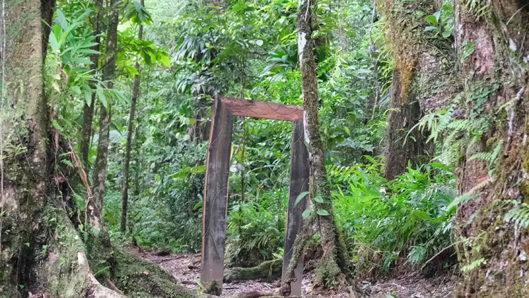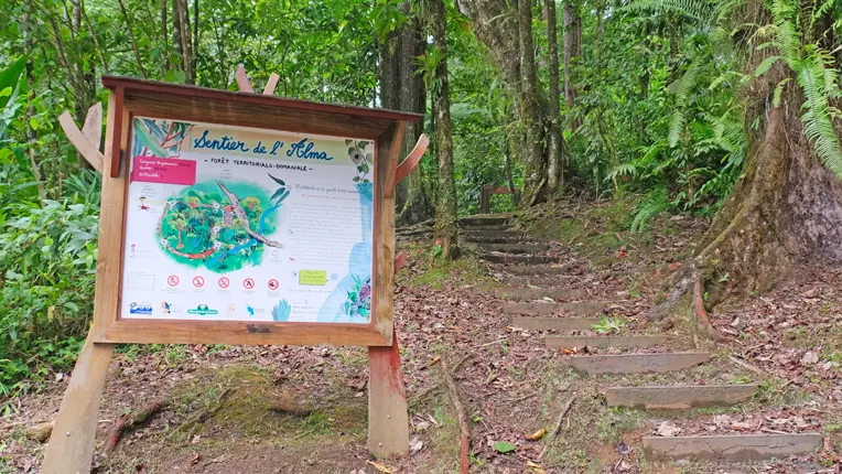 Partez à droite pour retourner dans la forêt. Par ici, les mahoganys, mahots bleus et bois blancs se dressent majestueusement dans la fraîcheur, au pied des pitons du Carbet.