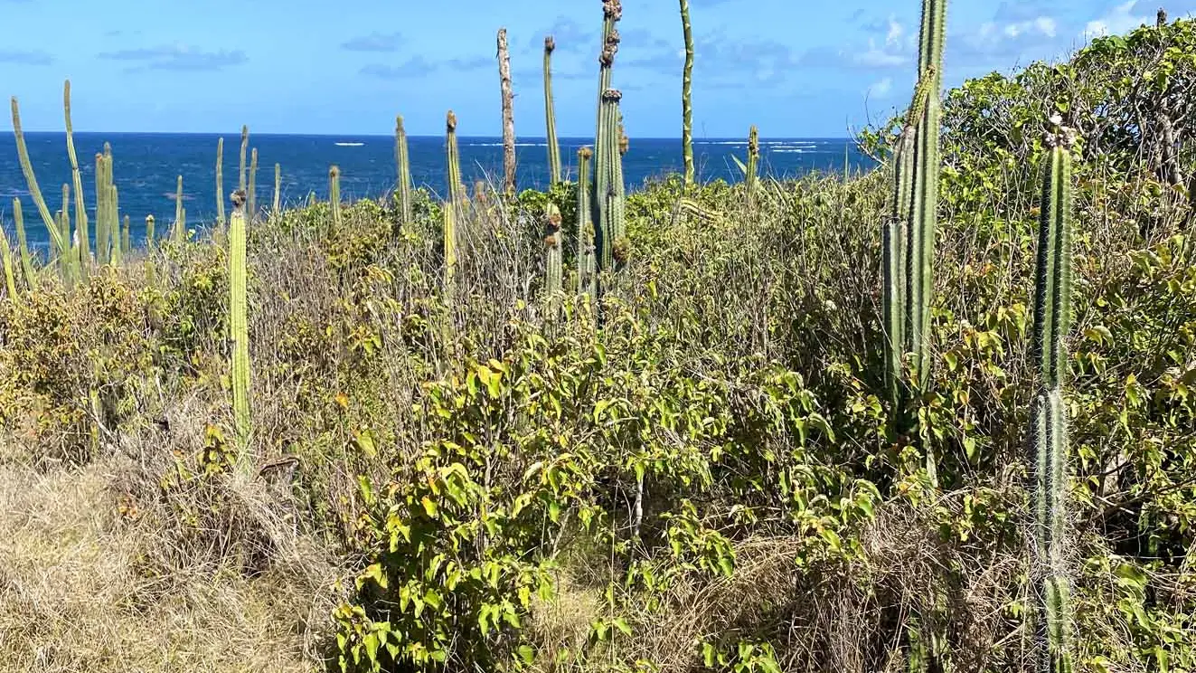 A la croisée, prenez le chemin à droite (7), descendez et traversez une forêt de cactus qui arrive à la pointe du Vauclin (8).