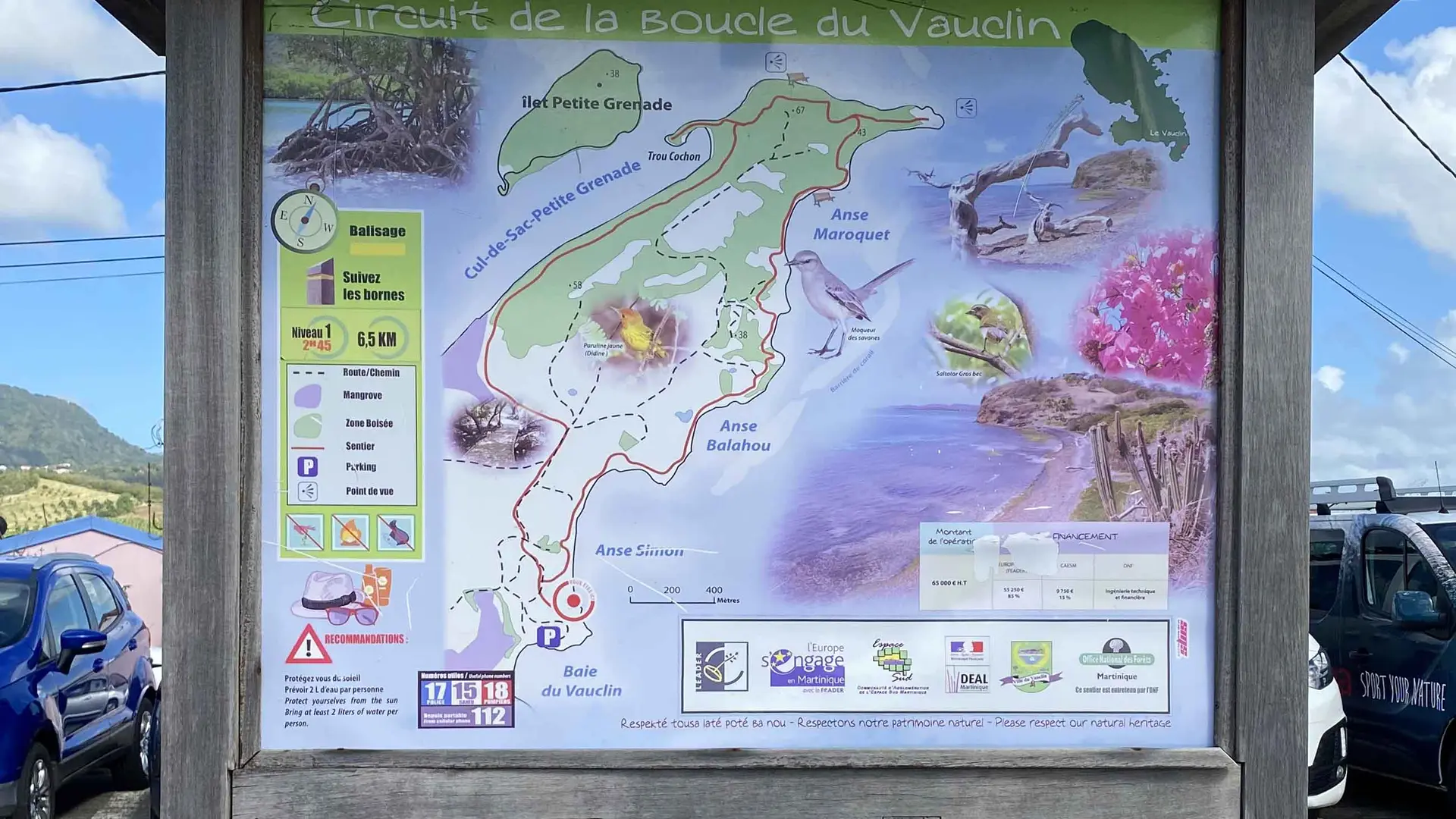 A partir du parking du centre UCPA, empruntez la route sur la droite sur 150m, puis descendez sur le chemin en terre à droite (1). Longez la plage de l’anse Simon, montez les escaliers. A l’intersection poursuivez tout droit en bord de mer (2). Le sentier longe les maisons avant de grimper dans la forêt sèche, puis redescend vers la mer. Traversez le village de pêcheurs de l’anse Maroquet (3). Vous pourrez observer les techniques de pêche traditionnelle.