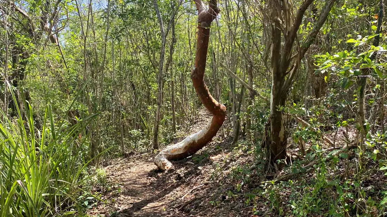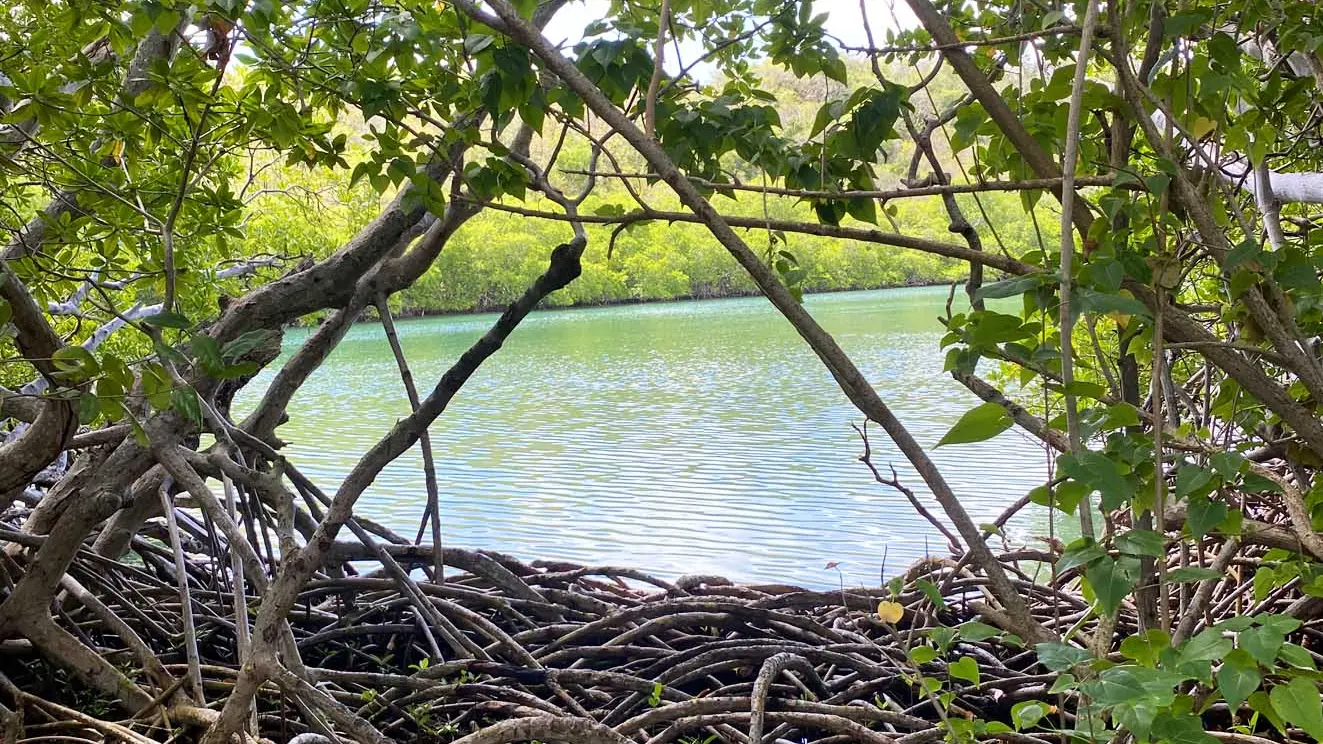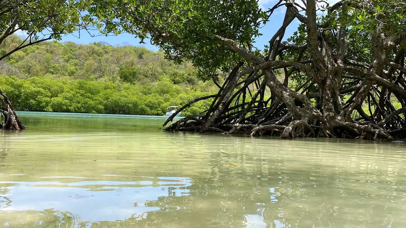 Revenez à l’intersection (7) et descendez le sentier à droite. Vous passerez devant de magnifiques points de vue sur la baie du Vauclin et la mangrove de Trou Cochon (9). Arrivé au panneau sur la mangrove, prenez à droite (10) et longez-la jusqu’à la mangrove de Trou-Cochon (11).
