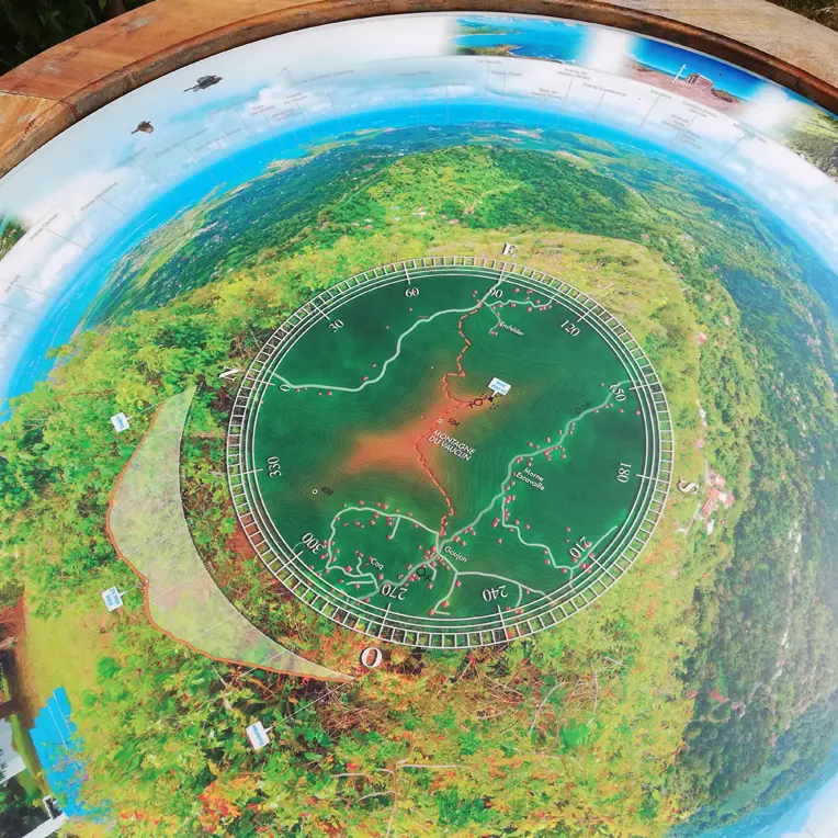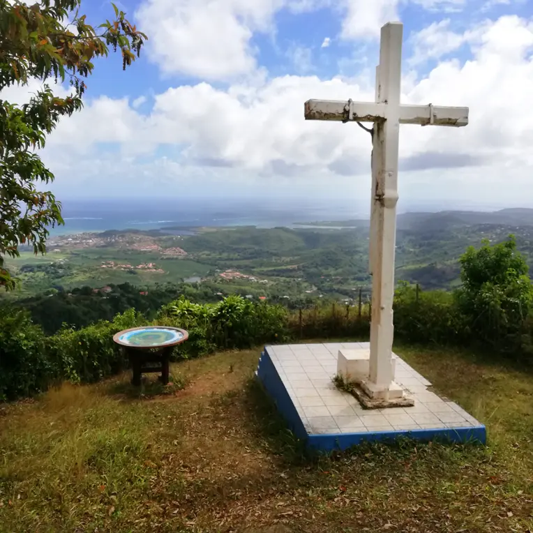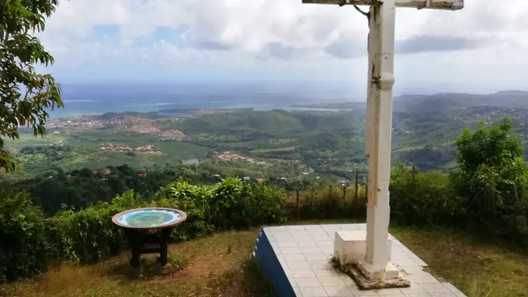 Empruntez le sentier du chemin de croix jusqu'à la petite chapelle (un peu en contrebas du sommet Notre-Dame-Des-Sept-Douleurs) puis rejoignez le sommet, continuez après l'oratoire et avancez jusqu'au point de vue. Enfin la récompense pour tous vos efforts : une splendide vue panoramique sur toute la moitié sud de la Martinique, des îlets du François à gauche aux caps du sud (Cap Macré, Cap Ferré...) à droite (2).