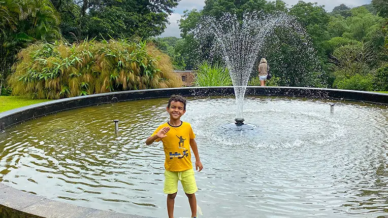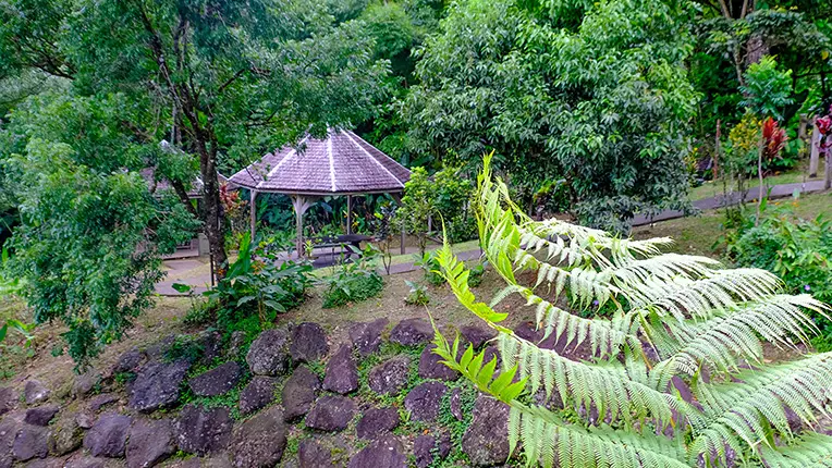 À la vue de la Montagne Pelée se dissimulant à peine entre les nuages, à l’écoute discrète du siffleur des mornes tapi dans la forêt humide, le temps semble s’arrêter. Le relief escarpé a été attendri et laisse désormais place à des espaces soigneusement aménagés. La découverte est alors ponctuée d’escales ludiques et enrichissantes.
