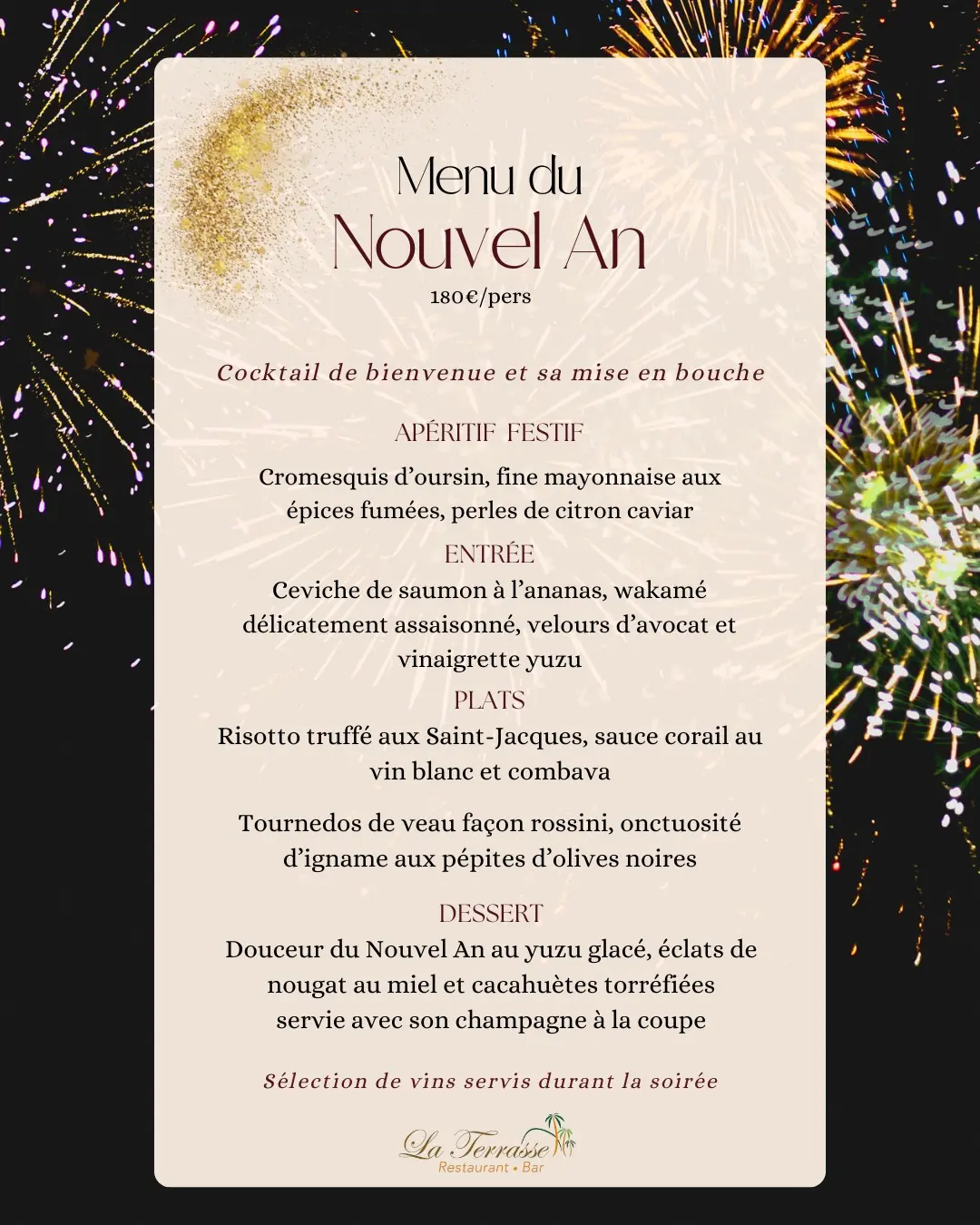 Célébrez le 31 décembre autour d’un menu raffiné et d'une soirée animée dans une ambiance chaleureuse et festive.
