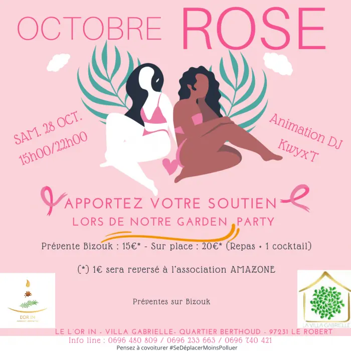 Apportez votre soutien aux malades et leur famille en participant à notre Garden Party OCTOBRE ROSE au restaurant le L'or In à la Villa Gabrielle au Robert le samedi 28 octobre de 15h à 22h.