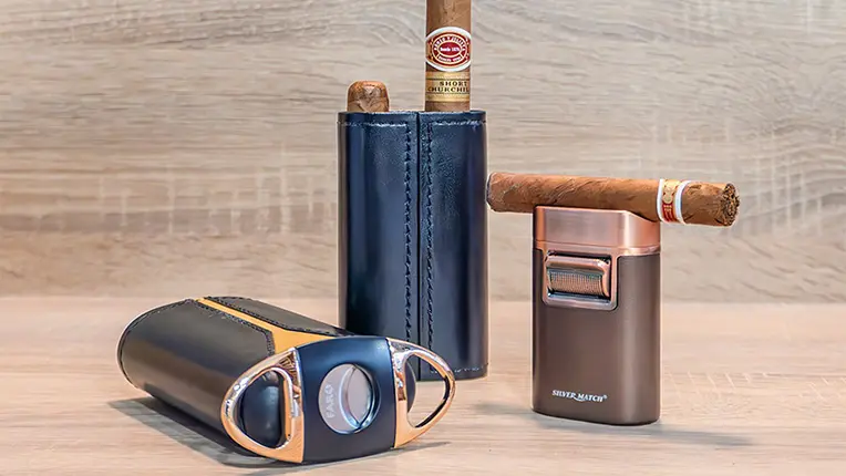 Pour les amateurs, la cave à cigares conserve une belle sélection dans des conditions optimales, accompagnée de tous les accessoires de fumeur : briquets, cendriers, étuis et caves.