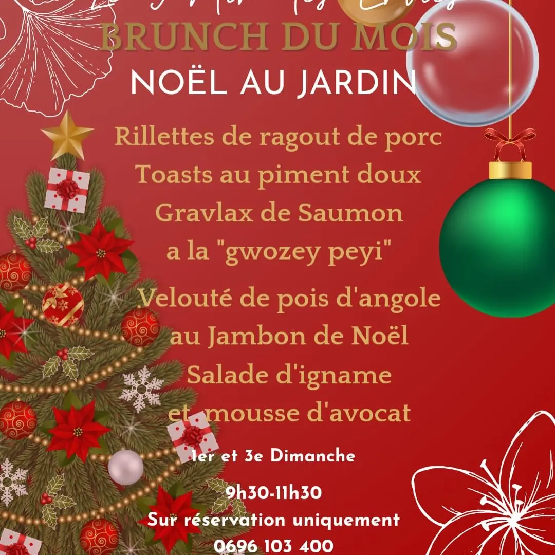 Rendez-vous au restaurant Le Jardin des Envies au Village de la Poterie aux Trois-îlets pour le brunch de Noël du 21 décembre 2025.