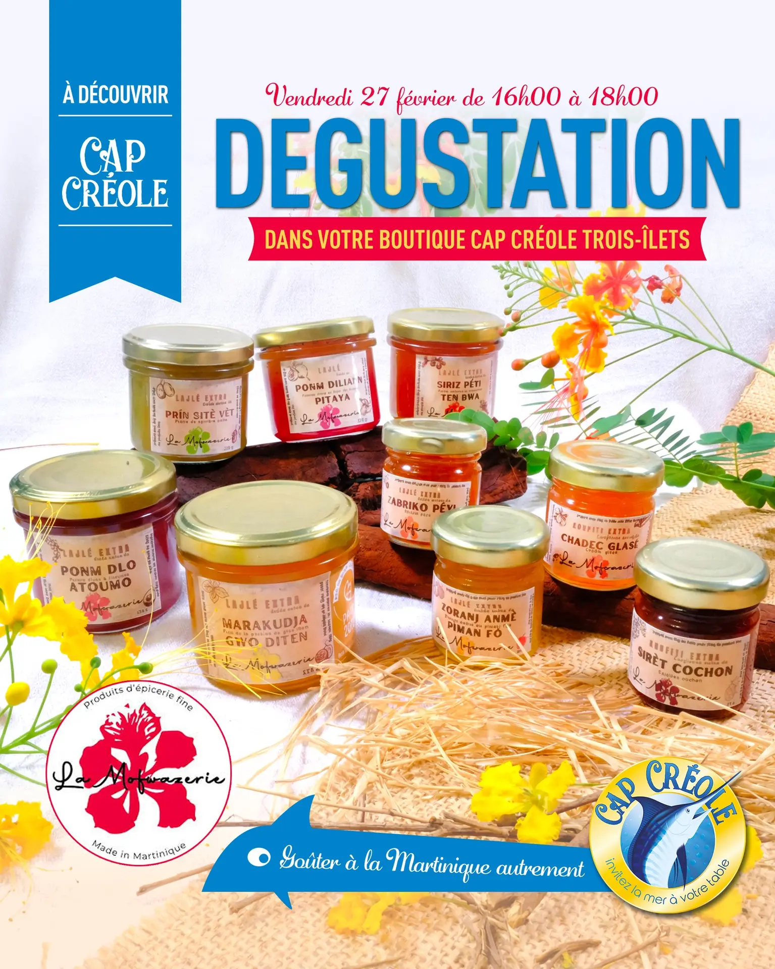 Rendez-vous le vendredi 27 février de 16h à 18h à la boutique Cap Créole aux Trois-ilets pour une dégustation des confitures et gelées artisanales de La Mofwazerie.