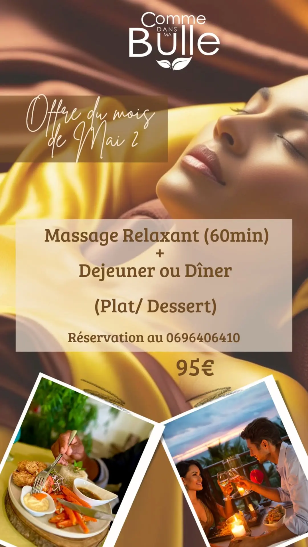 - Massage relaxant (60 min) + Un déjeuner ou un dîner (Plat/dessert) Tarif : 95€/pers