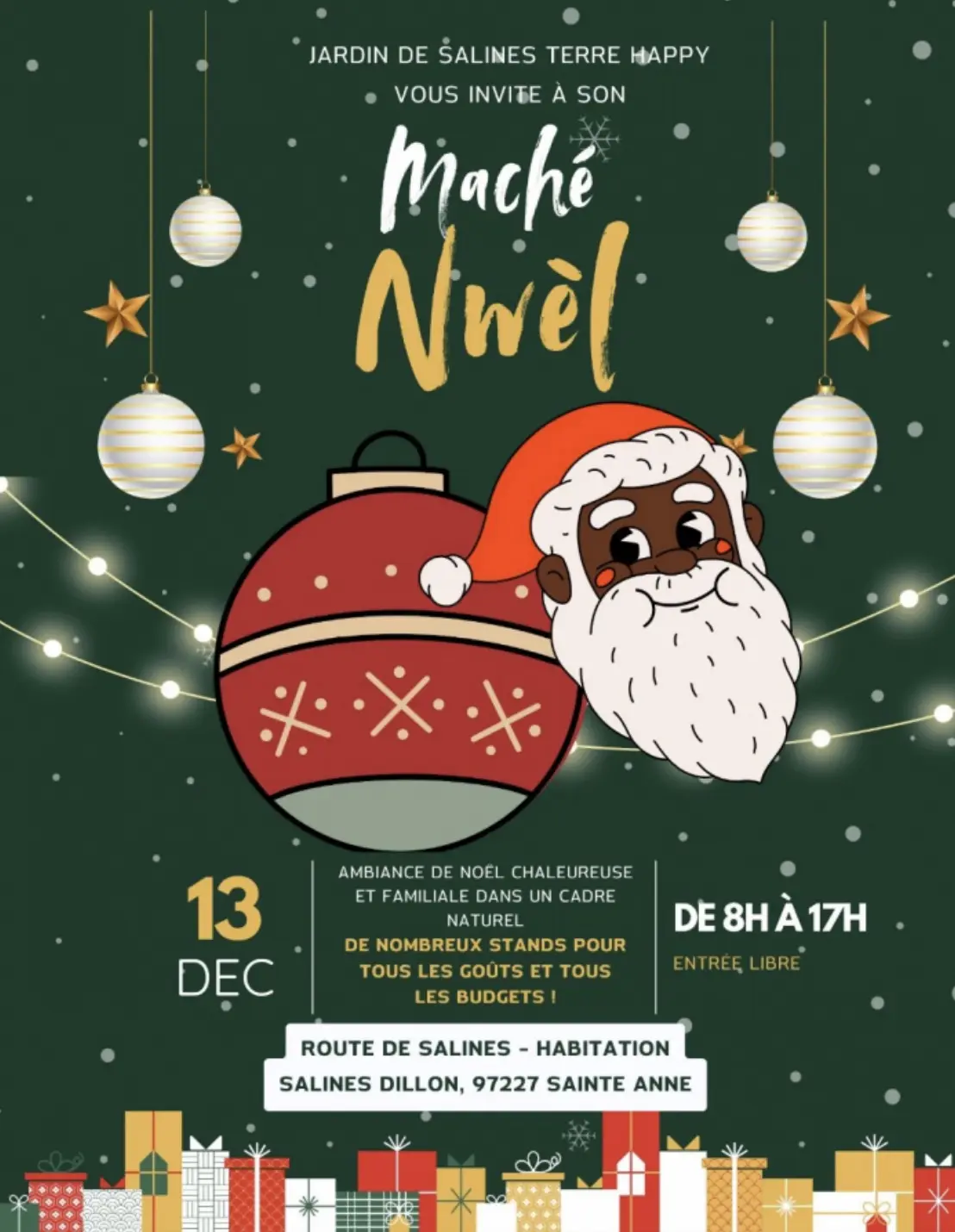 L'Association Jardin de Salines Terre Happy vous convie à leur marché de Nwèl le samedi 13 décembre de 08h à 17h à l'Habitation Salines Dillon à Sainte-Anne.