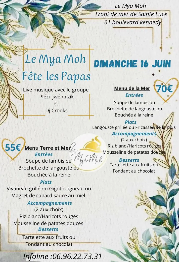 Découvrez le menu de la Fête des Pères du restaurant Le Mya-Moh à Sainte-Luce.