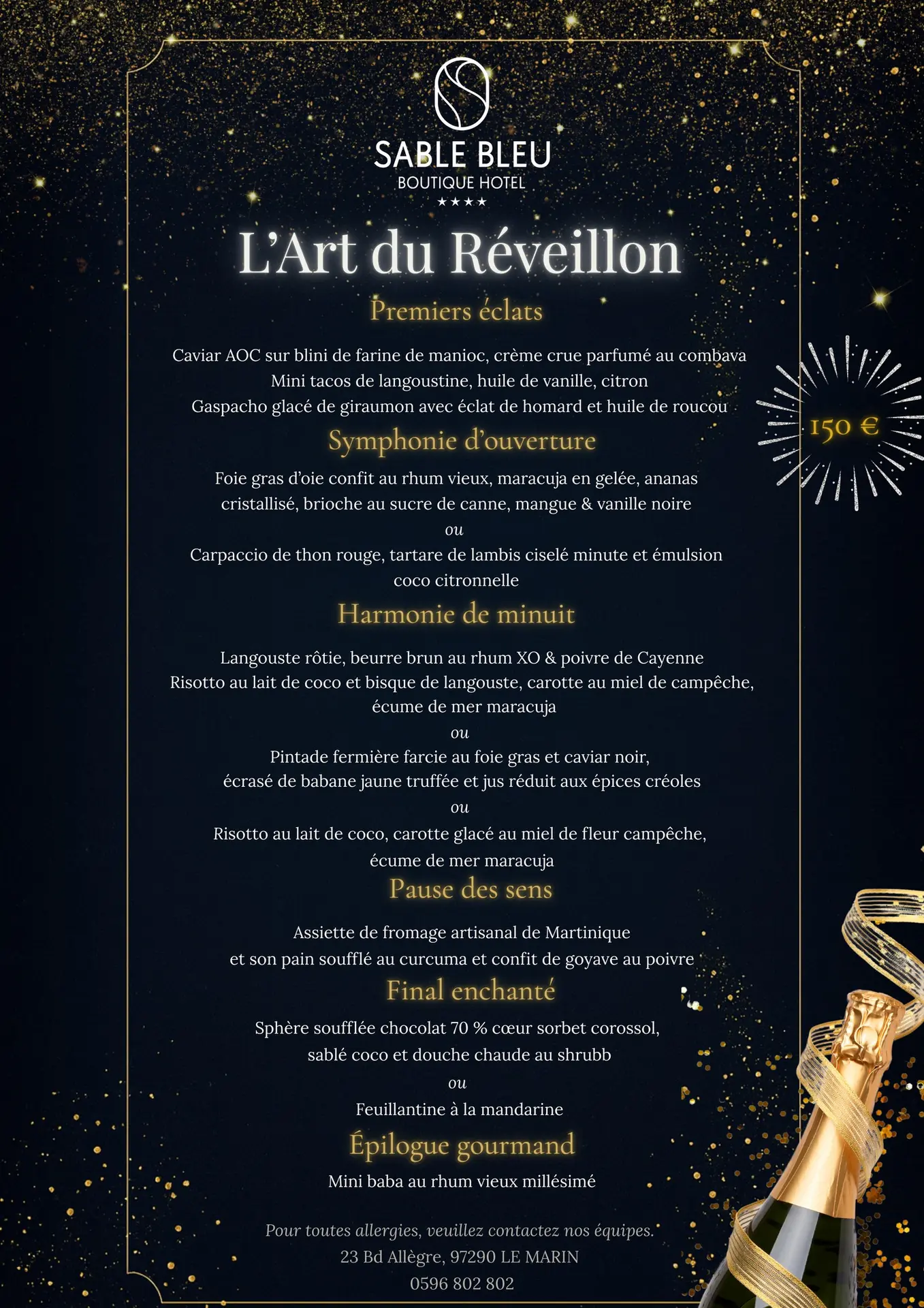 Pour célébrer le passage à la nouvelle année, Sable Bleu vous invite à vivre une soirée d’exception autour de son dîner de la Saint-Sylvestre.