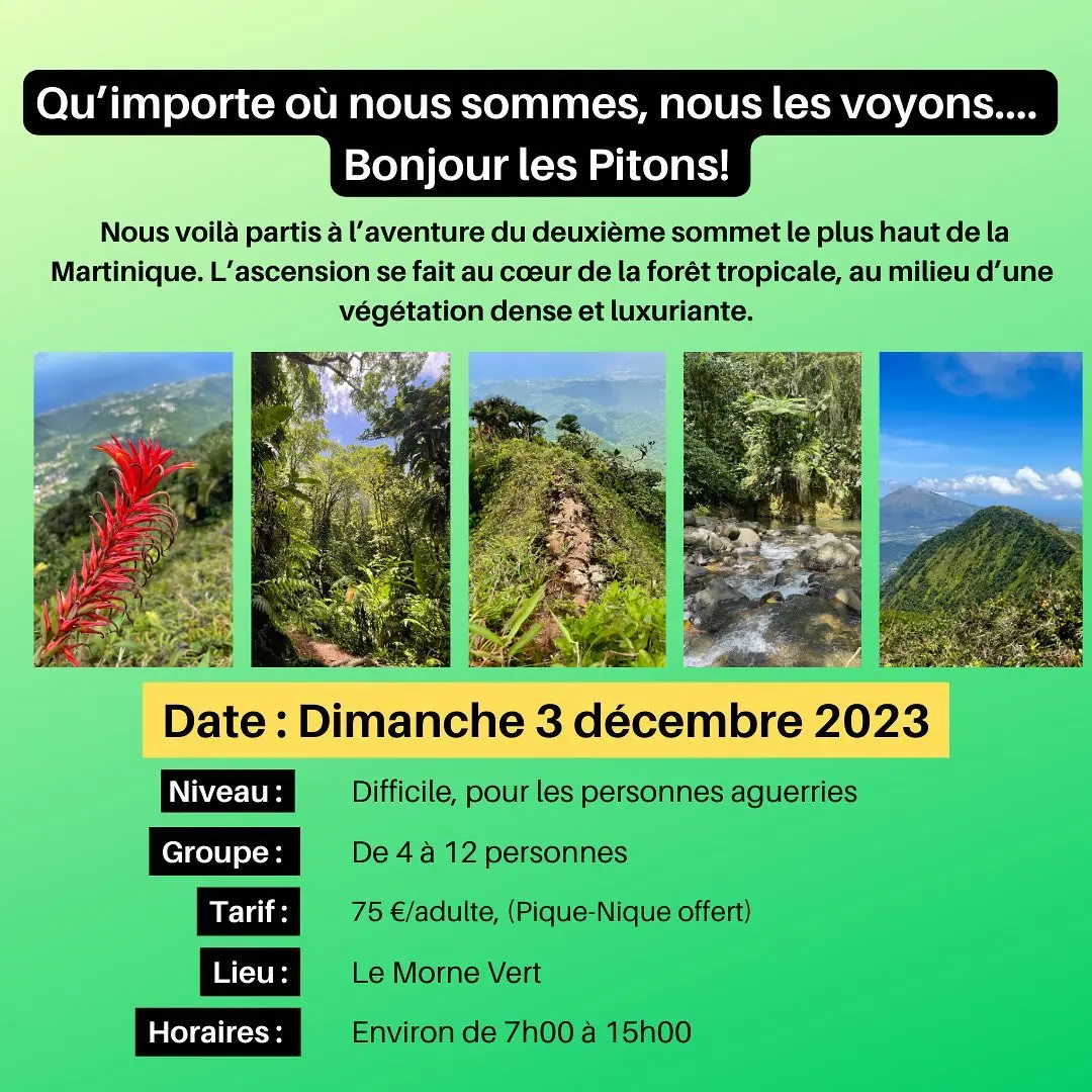 L'ascension se fait au coeur de la forêt tropicale, au milieu d'une végétation dense et luxuriante. Vous y verrez quelques espèces endémiques à l'île. Si le temps est favorable, nous aurons des magnifiques panoramas sur toute la Martinique.