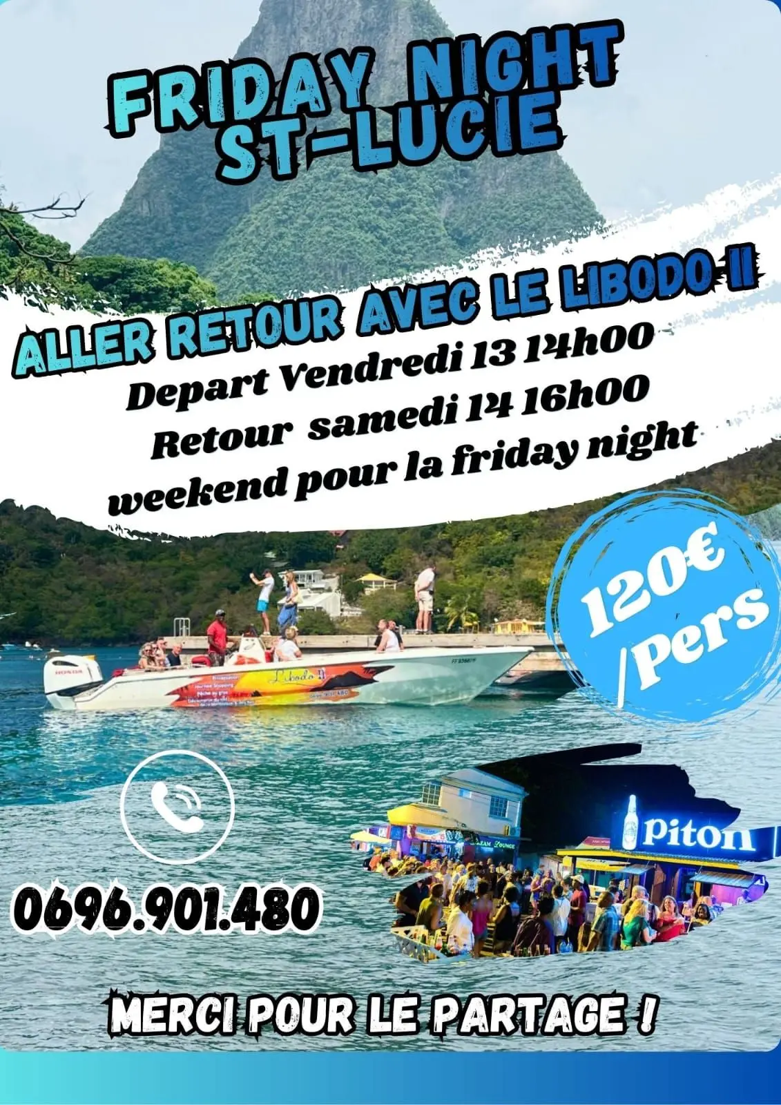 Libodo II Excursions au départ de Rivière-Pilote, vous propose des transferts aller/retour du vendredi au dimanche pour aller vibrer à Sainte-Lucie pour les Friday night de Gros-ilet.
