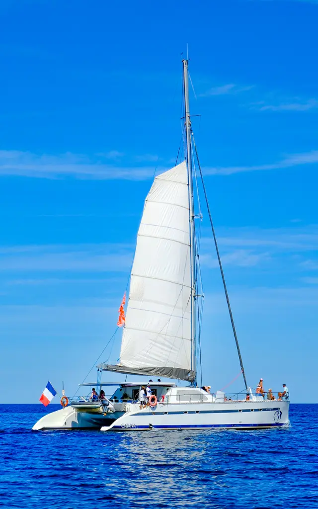 L’accès jusqu’au catamaran se fait très facilement, une annexe assure le transfert jusqu’au catamaran Pélagia, mouillé à une cinquantaine de mètres dans la baie de Génipa, près de l’îlet Mandoline. Cette courte traversée donne déjà un aperçu du cadre exceptionnel dans lequel allez vivre l’excursion.
