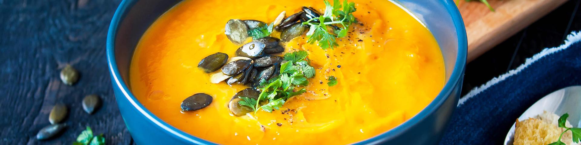 Faites revenir l’oignon avec l’huile d’olive, ajoutez l’ail, le thym, le laurier, la cardamome et, par la suite, le giraumon.