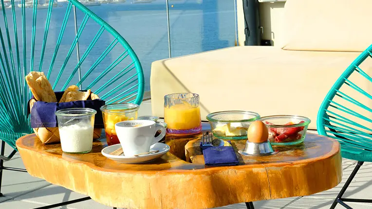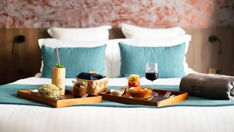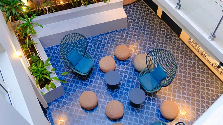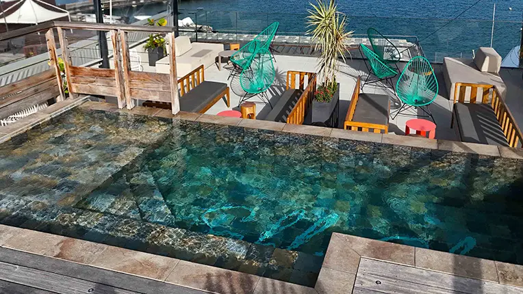 Perché au 4 ème étage, le rooftop « Le Blue » de Sable Bleu, avec sa piscine à débordement, son bar, ses espaces lounges et sa vue à 180°, est parfait pour apprécier un cocktail signature, admirer le coucher du soleil ou simplement savourer l’instant.
