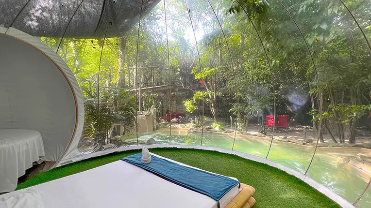Mûri pendant 10 ans, le projet est né de l’imagination de la famille propriétaire du domaine. La forêt en friche a été aménagée en respectant les ressources naturelles, mettant en valeur les arbres, la mare et les vestiges d’une petite maison en pierre. Ils ont choisi le concept des bulles pour leur originalité et leur impact environnemental raisonné. Ouvert depuis 2016, le domaine propose un art de vivre à la balinaise : cocktail de bienvenue, espace bien-être et massage, service en chambre discret. Disponible sans être intrusive, toute la famille est mobilisée pour faire de votre séjour une expérience de vie inoubliable.