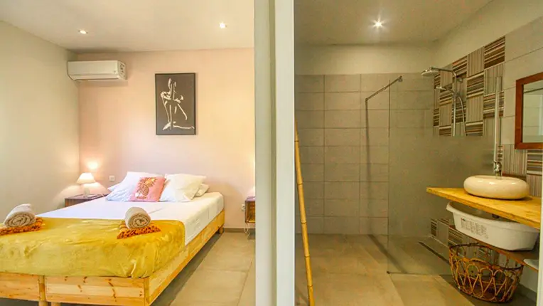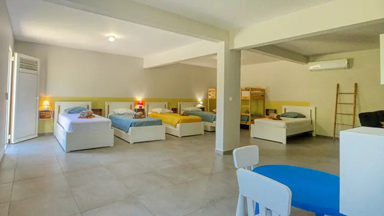 L'espace nuit est composé de trois chambres, climatisée et équipée de lit Queen size, ainsi que d'une salle de bain attenante avec douche à l'italienne. Un dortoir climatisé de 80 m² attend les plus jeunes, équipé 5 lits 1 pers et d'1 lit superposé. Les enfants auront leur coin salon, et leur salle de bain avec double vasques, 2 douches à l'italienne.